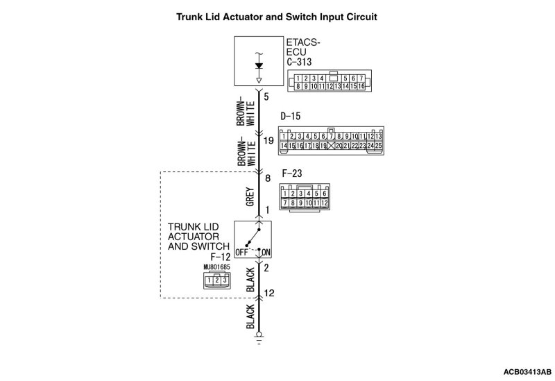 STEP 6. Check the wiring harness between trunk lid actuator and switch connector F-12 (terminal 1) and ETACS-ECU connector C-313 (terminal 5).