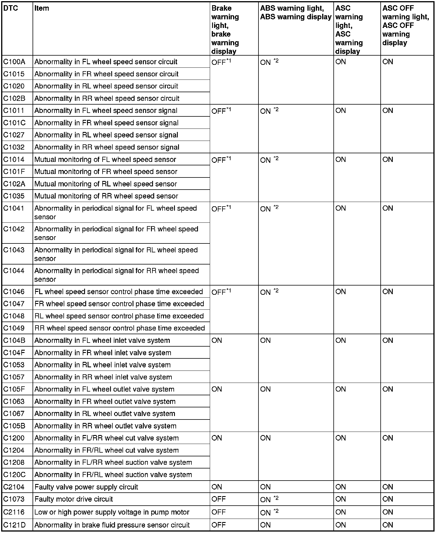 ASC-ECU constantly monitors the input and output signals. If an error is detected in the system, ASC-ECU sends a fail signal and the corresponding indicator light is illuminated or blinks. Various controls are processed depending on the cause of malfunction as shown below.
