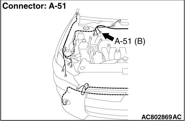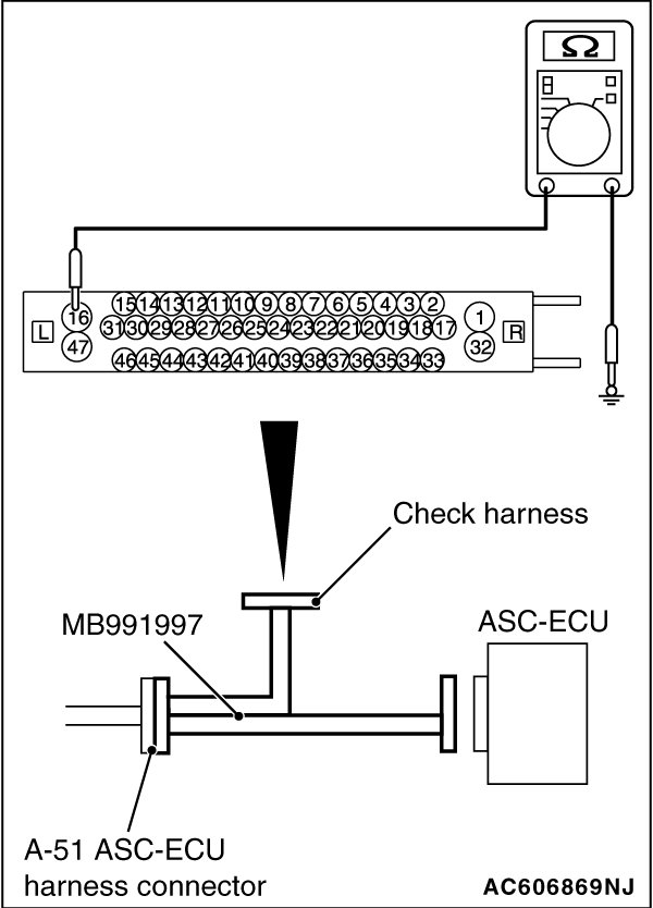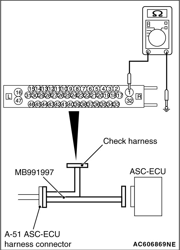 (2)Disconnect the A-51 ASC-ECU connector, connect special tool ASC check harness (MB991997) to the harness-side connector, and then measure the resistance at the special tool connector side.