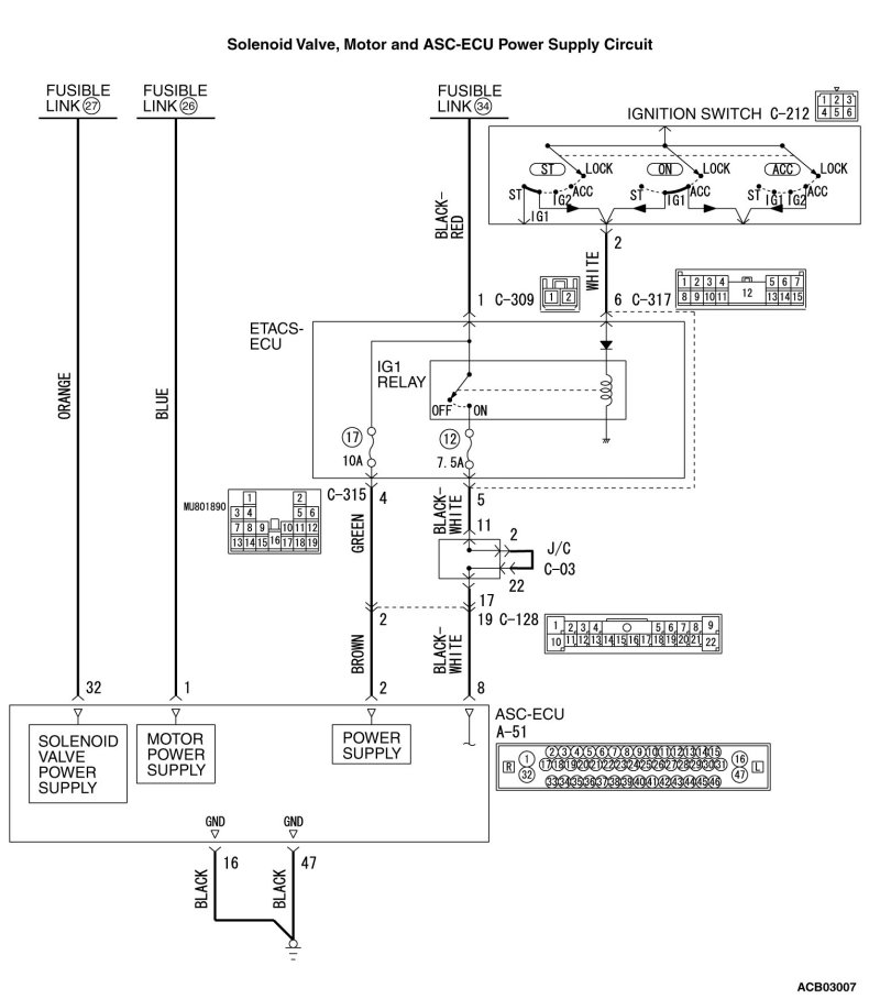 - ASC-ECU contains the power supply circuit (terminal No.8) for ASC-ECU. When the ignition switch (IG1) is turned ON, the voltage is applied to the relay incorporated in ETACS-ECU to turn ON the relay, and the power is supplied from the fusible link No.34 through multi-purpose fuse No.12.