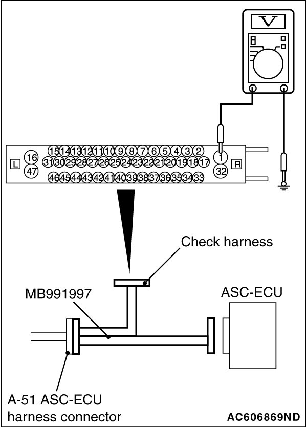 (1)Disconnect the ASC-ECU connector, connect special tool ASC check harness (MB991997) to the harness-side connector, and then measure the voltage at the special tool connector side.