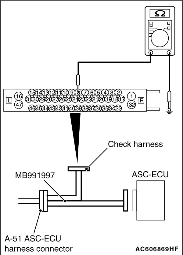 (1)Disconnect the ASC-ECU connector, connect special tool ASC check harness (MB991997) to the harness-side connector, and then measure the resistance at the special tool connector side.