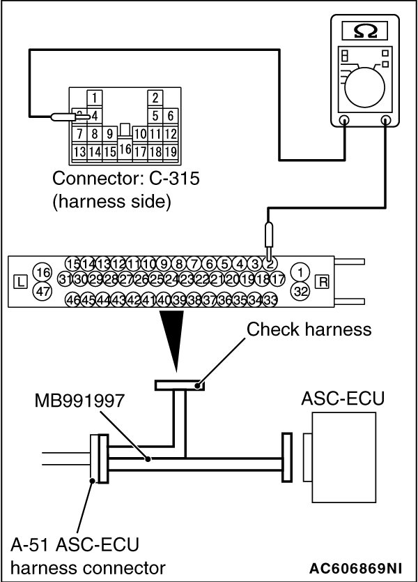 (3)Measure the resistance between the A-51 ASC-ECU connector terminal No.2 and the C-315 ETACS-ECU connector terminal No.4.
