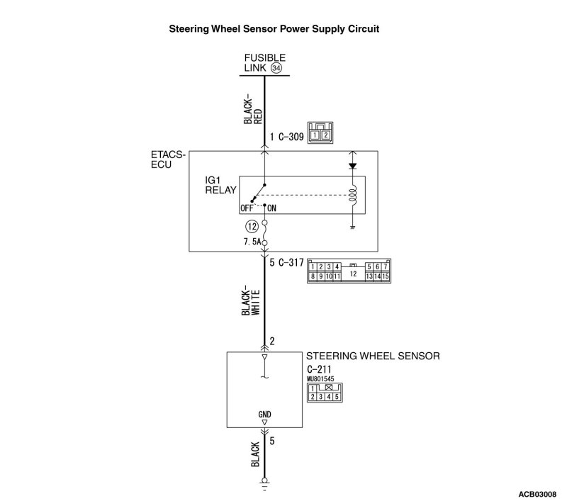 - Steering wheel sensor contains the power supply circuit (terminal No.2) for Steering wheel sensor. The power is supplied from the ETACS-ECU (terminal No.5). The power is supplied from the fusible link No.34 through the multi-purpose fuse No.12.