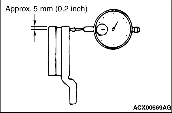 3. Place a dial gauge ca. 5 mm (0.2 inch) inward from the circumference of the brake disc to measure its run-out.