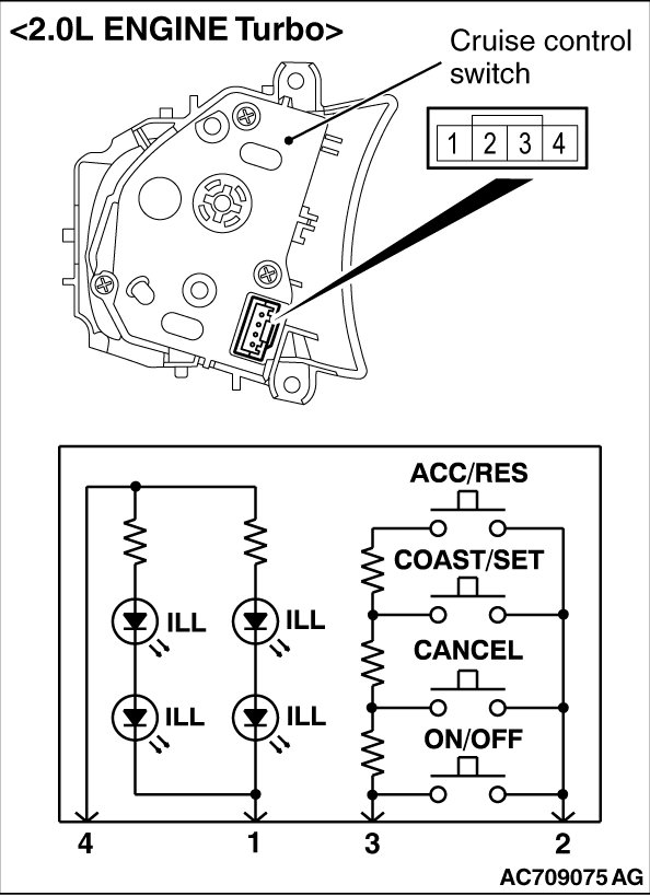 3. Check that the cruise control switch illuminates when a positive battery terminal is connected to the connector terminal number 4, and terminal number 1 is grounded.