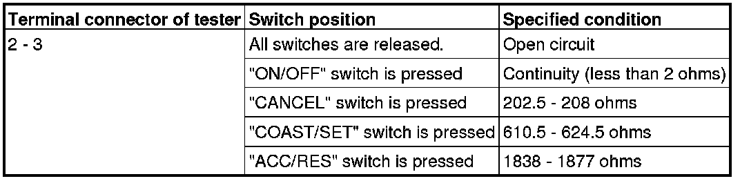 "ON/OFF", "CANCEL", "COAST/SET" and "ACC/RES" switches is pressed. If the values measured at the time each switch is pressed correspond to those in the table below, the resistance values are correct.