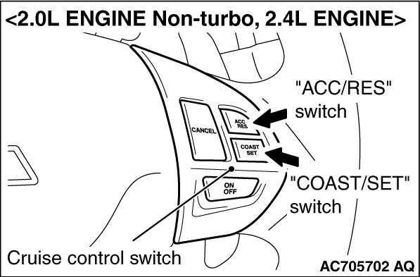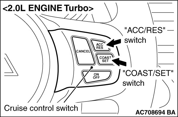 1. Turn the ignition switch to the "ON" position while press the "COAST/SET" switch. Then, within one second, release the "COAST/SET" switch and press the "ACC/RES" switch.
