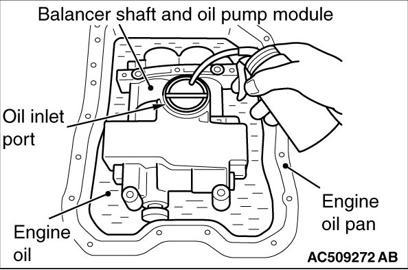 (1) Clean the inside of the removed engine oil pan, and put the balancer shaft and oil pump module into the engine oil pan with its oil inlet port facing up.