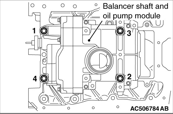 6. Loosen each balancer shaft and oil pump module mounting bolts fully in the reverse sequence to that shown.