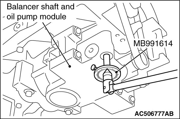 8. After tightening to the specified torque, tighten the balancer shaft and oil pump module mounting bolts to 135 degrees angle, using special tool MB991614, in the order of number shown in the figure.
