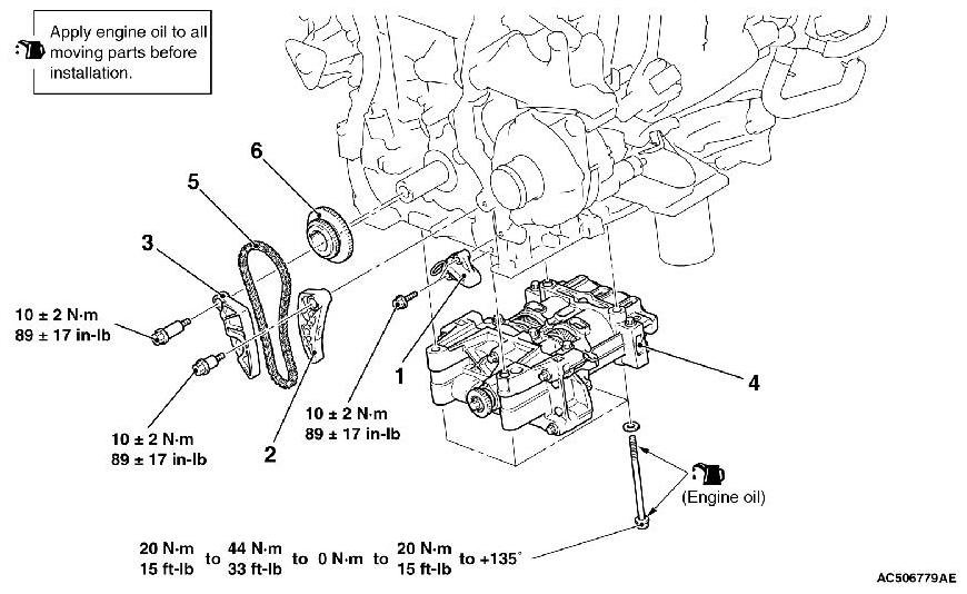 1. When installing the new balancer shaft and oil pump module, apply oil to the oil pump in the balancer shaft and oil pump module and the balancer shaft bearing as follows.
