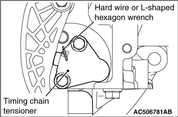 2. Remove the hard wire or L-shaped hexagon wrench fixing the plunger of the timing chain tensioner to apply tension to the balancer timing chain.