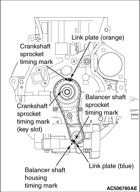 2. With the link marks (orange or blue) of balancer timing chain aligned with the timing marks of balancer sprocket and crankshaft sprocket, install the balancer shaft and oil pump module together with the balancer timing chain and crankshaft sprocket as one unit to the cylinder block. At this time, securely bring the balancer shaft and oil pump module into contact with the rudder frame mounting area.