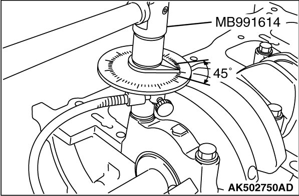 5. Use special tool Angle gauge (MB991614) to tighten bolts 45°