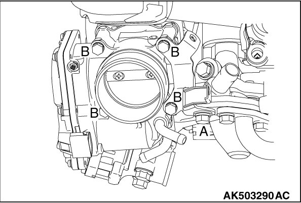 4. Tighten the throttle body mounting bolts at illustrated position B to the specified tightening torque.