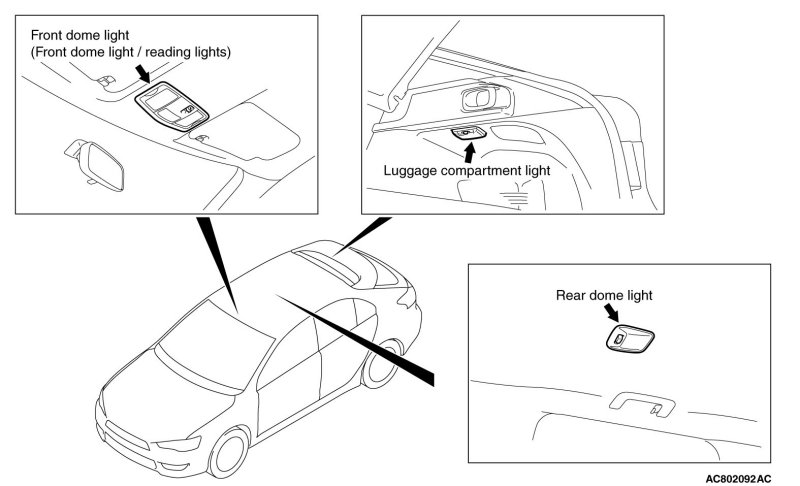 - The rear dome light, which illuminates the rear passenger's seat, is installed above the rear seat. [Vehicle without sunroof]