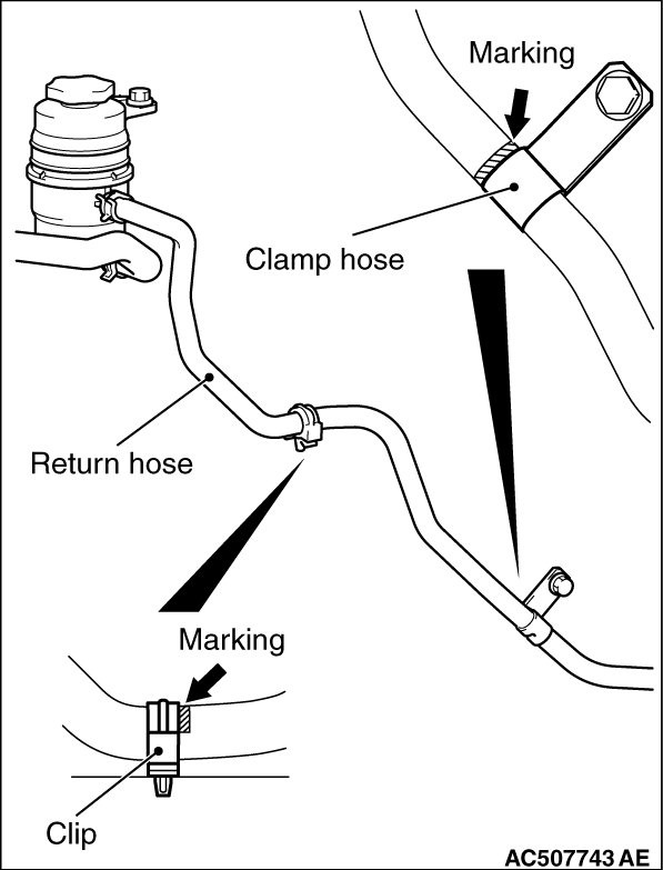 3. Using clip and hose clamp align the return hose marking within the area shown in the figure and connect the return hose.