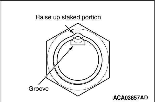 Set the special tool MB992700 in the groove of the driveshaft with its "UP" mark facing upwards. Then strike the staked portion of the driveshaft nut with the chisel and a hammer to raise up.