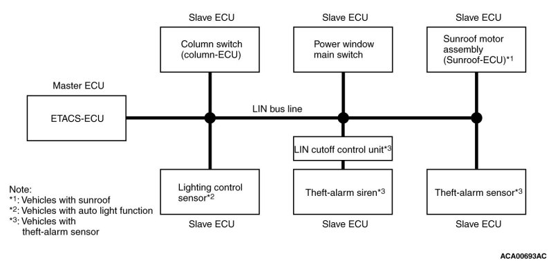 Master and slave ECUs are connected to the LIN bus lines. The master ECU is the ETACS*1-ECU, and the slave ECUs are the column switch (column-ECU), the power window main switch, the sunroof-ECU*2 and the lighting control sensor*3, the theft-alarm siren (via LIN cutoff control unit*4)*5 and the theft-alarm siren*5. The master ECU requests these slave ECUs to communicate each other via communication lines.