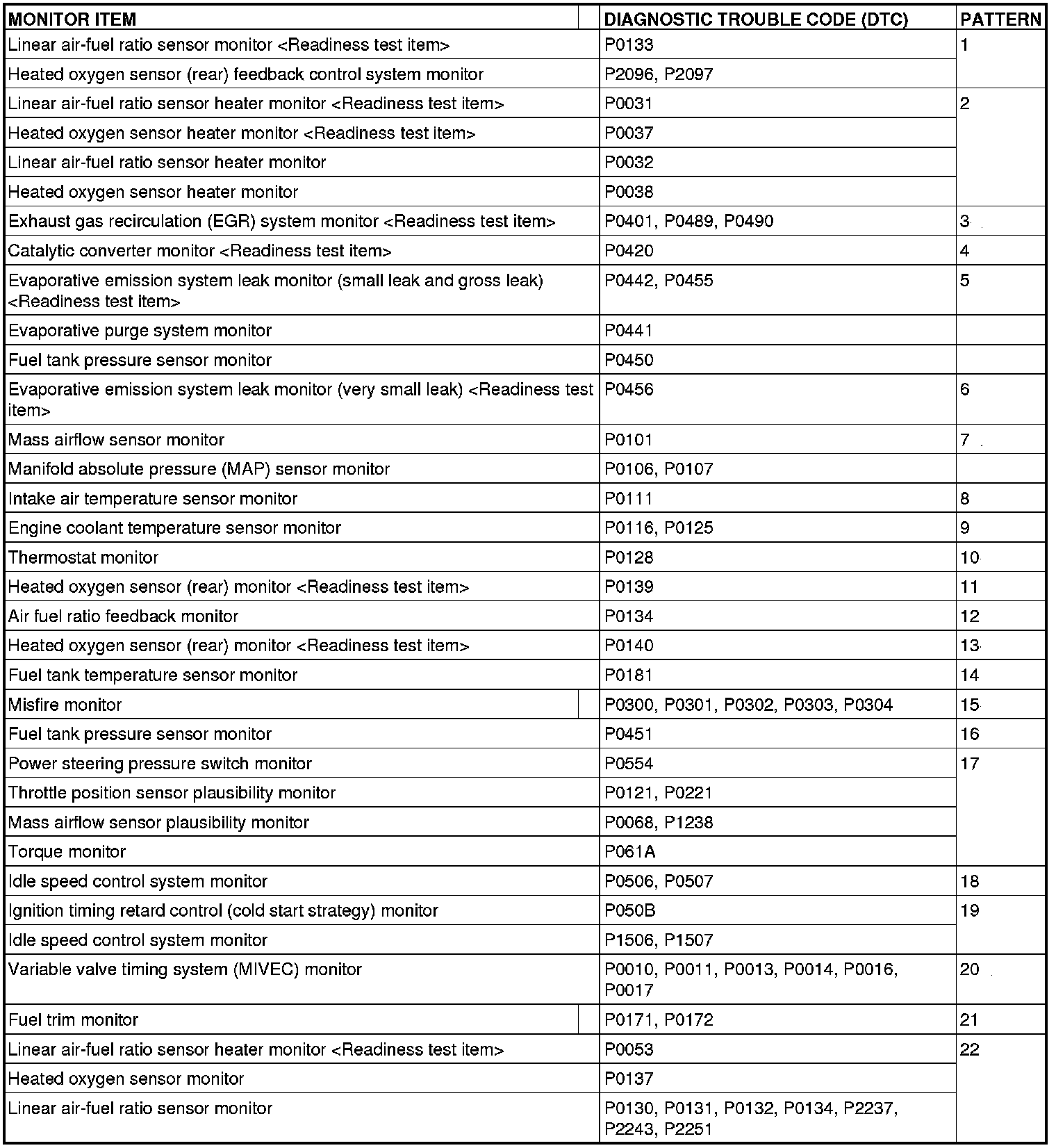 Drive cycle patterns are not established for Vehicle speed sensor monitor (DTC P0500), Power steering pressure switch monitor (P0551), and Fuel level sensor monitor (DTC P0461, 2066 [AWD]).