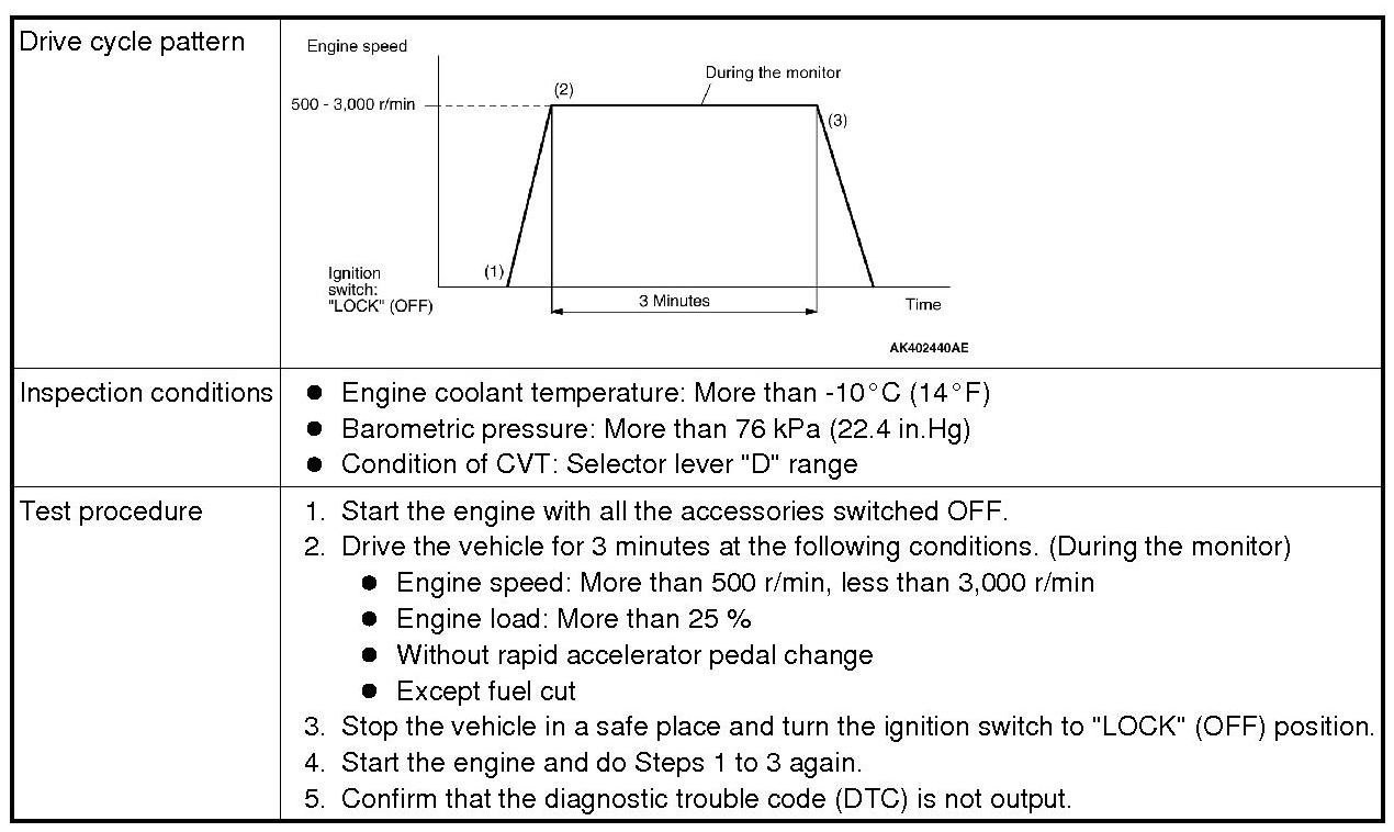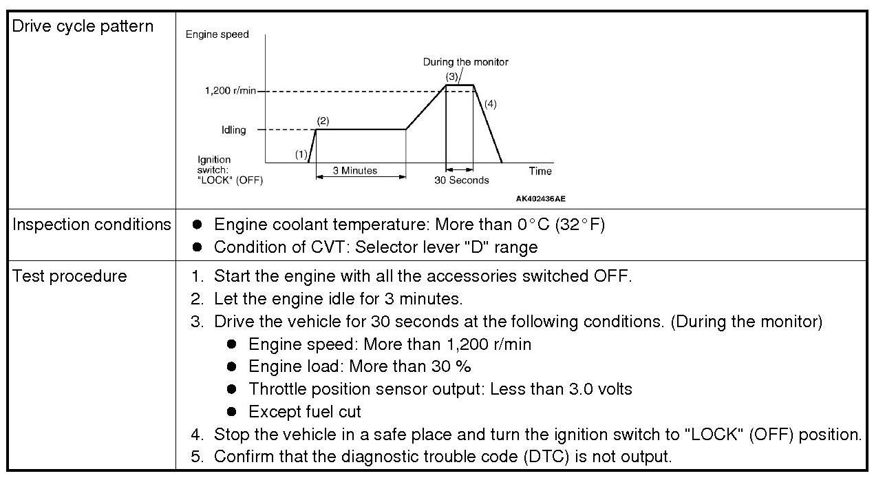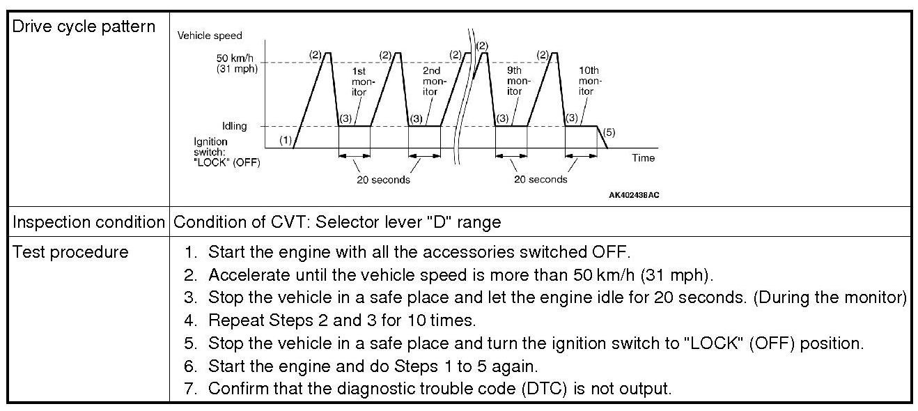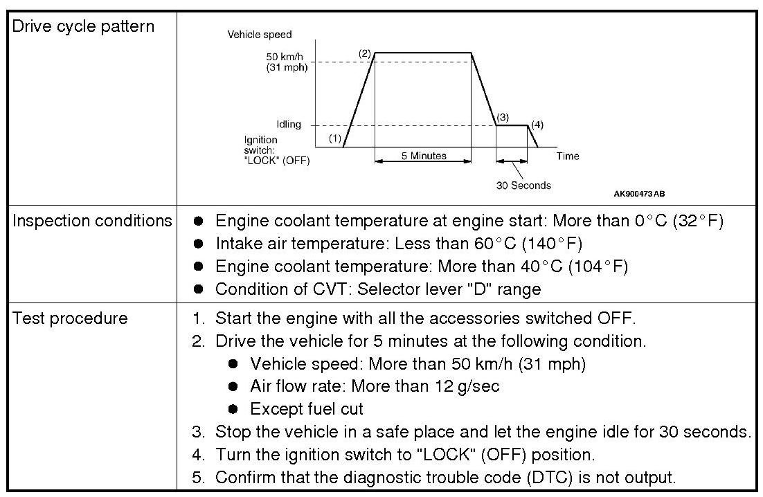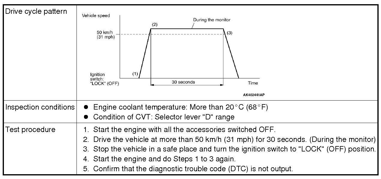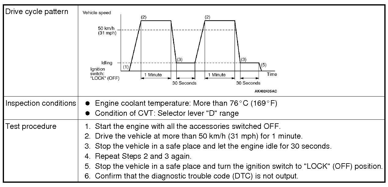 All kinds of diagnostic trouble codes (DTCs) can be monitored by carrying out a short drive according to the following 23 drive cycle patterns. In other words, doing such a drive regenerates any kind of trouble which involves illuminating the Malfunction Indicator Lamp (SERVICE ENGINE SOON or Check Engine Lamp) and verifies the repair procedure has been eliminated [the trouble the Malfunction Indicator Lamp (SERVICE ENGINE SOON or Check Engine Lamp) is no longer illuminated].