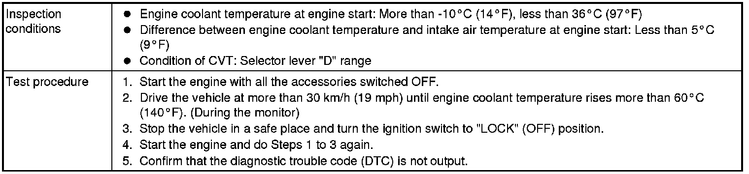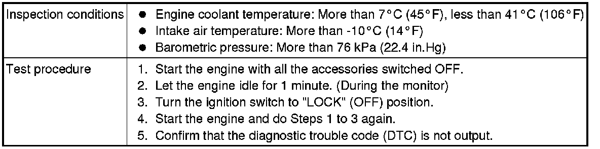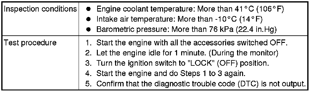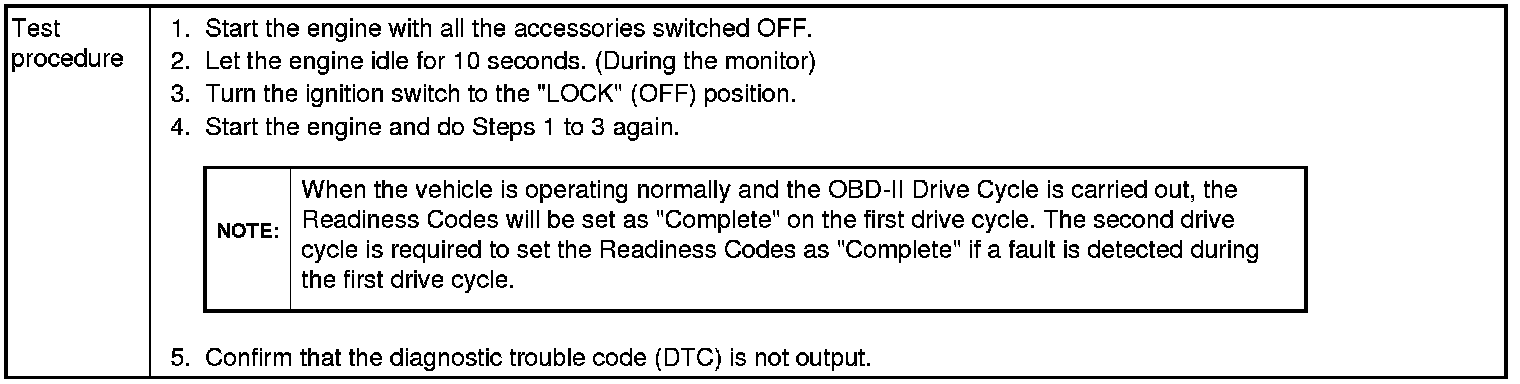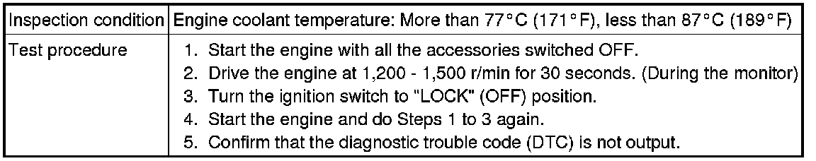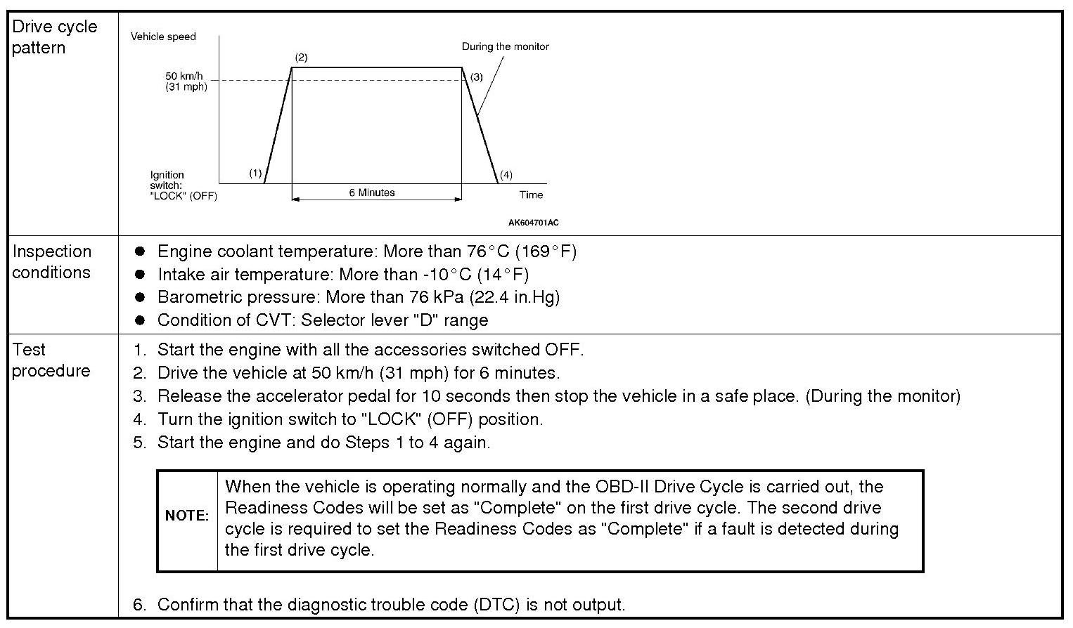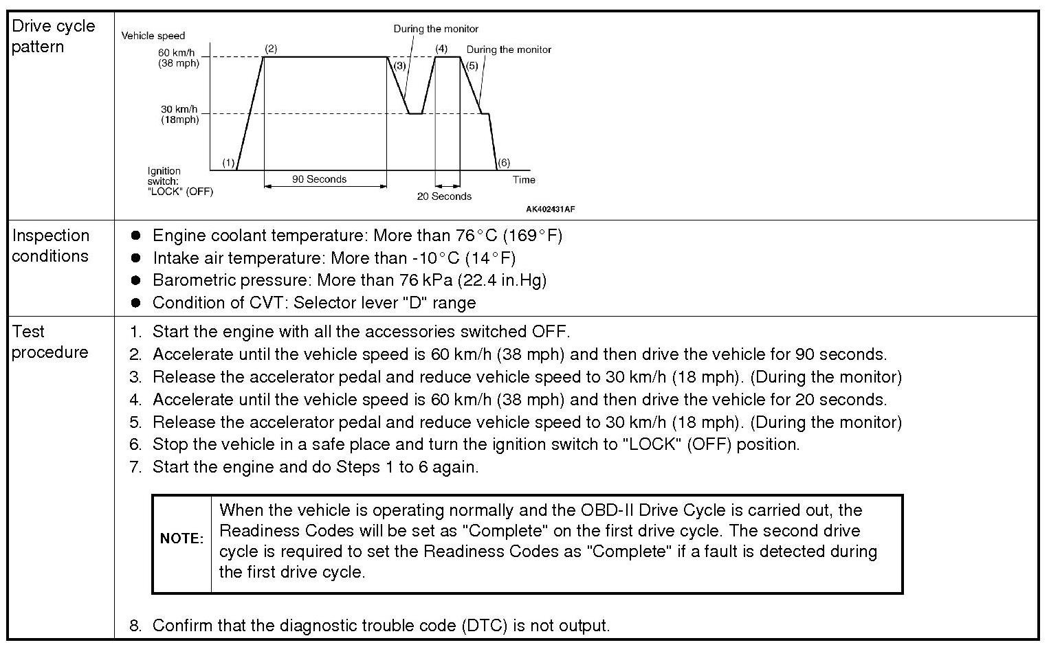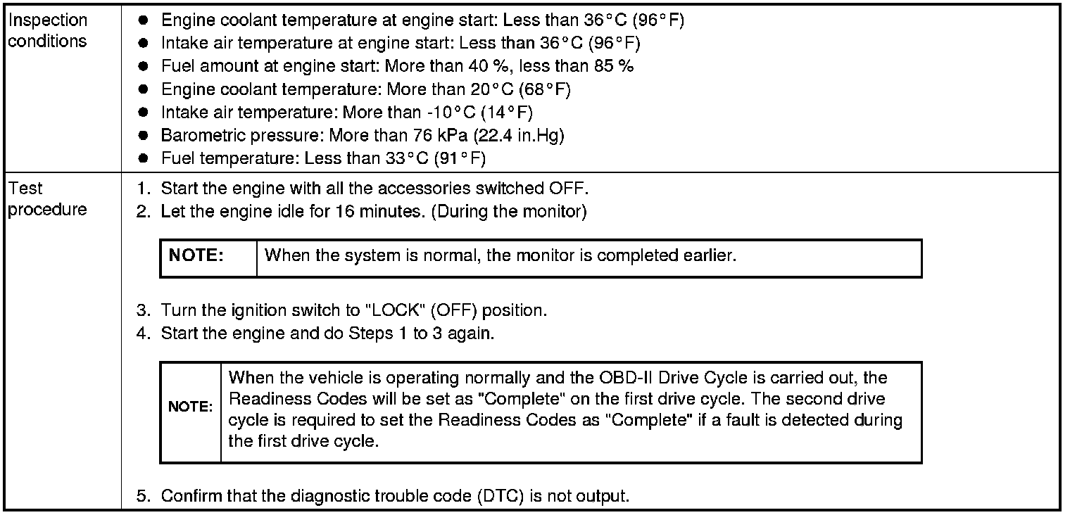 All kinds of diagnostic trouble codes (DTCs) can be monitored by carrying out a short drive according to the following 23 drive cycle patterns. In other words, doing such a drive regenerates any kind of trouble which involves illuminating the Malfunction Indicator Lamp (SERVICE ENGINE SOON or Check Engine Lamp) and verifies the repair procedure has been eliminated [the trouble the Malfunction Indicator Lamp (SERVICE ENGINE SOON or Check Engine Lamp) is no longer illuminated].