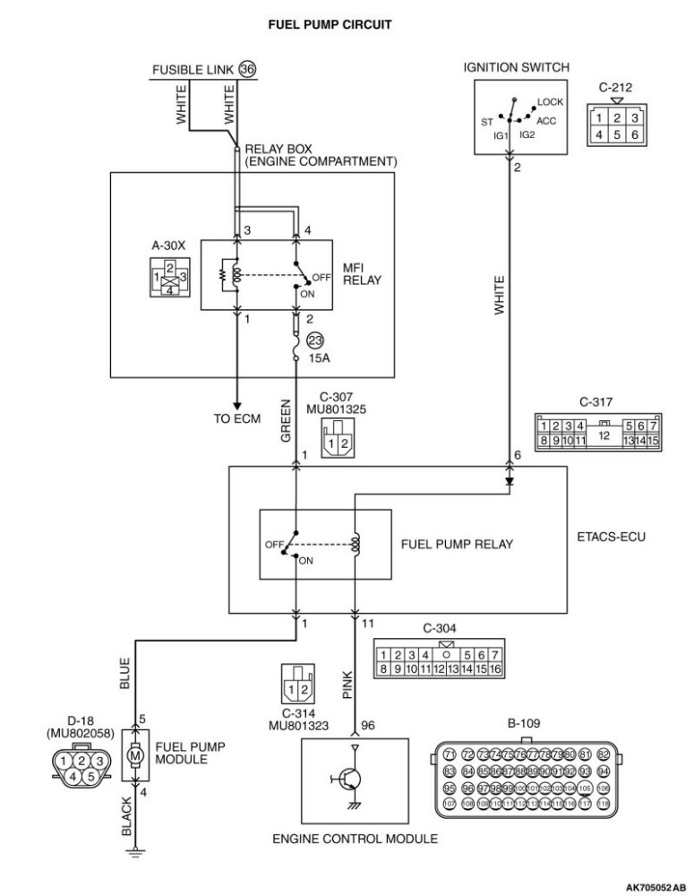 - The battery positive voltage is applied by the ignition switch to the fuel pump coil (C-317 ETACS-ECU connector terminal No. 6) in the ETACS-ECU. The ECM turns "ON" the relay by turning "ON" the power transistor in the unit so as to conduct power to the fuel pump relay coil (via the C-304 ETACS-ECU connector terminal No. 11).