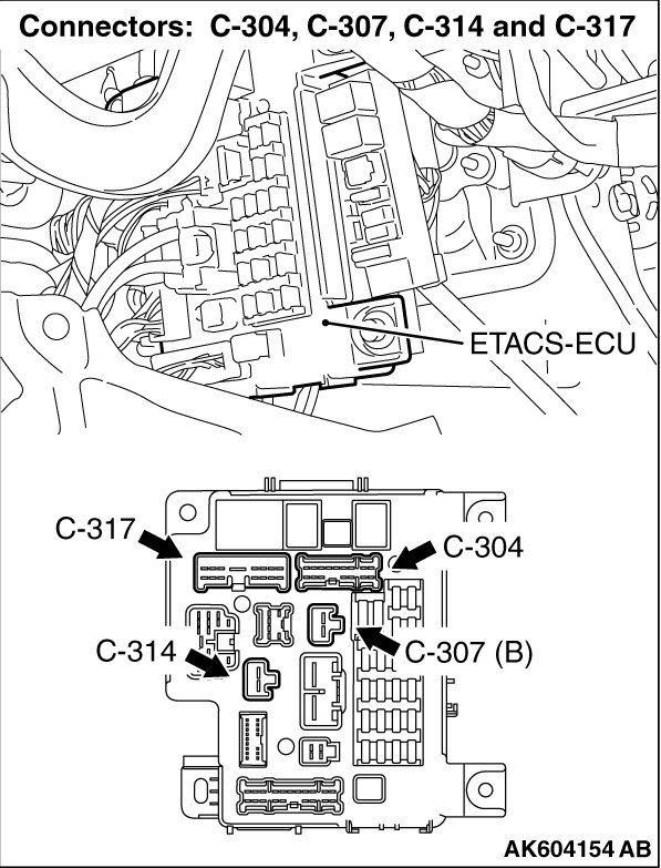 (3)Check for continuity between the C-307 ETACS-ECU terminal No. 1 and C-314 ETACS-ECU terminal No. 1 while connecting and disconnecting the jumper wire at the negative battery terminal.