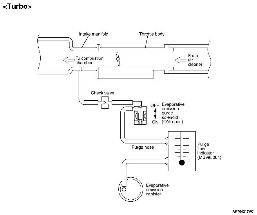 1. Disconnect the purge hose from the evaporative emission (EVAP) purge solenoid, and connect special tool MB995061 between the EVAP purge solenoid and the purge hose.