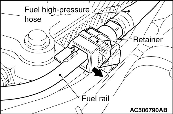 When pushing up the retainer of the fuel high-pressure hose connector, pay attention to avoid damage to the retainer.