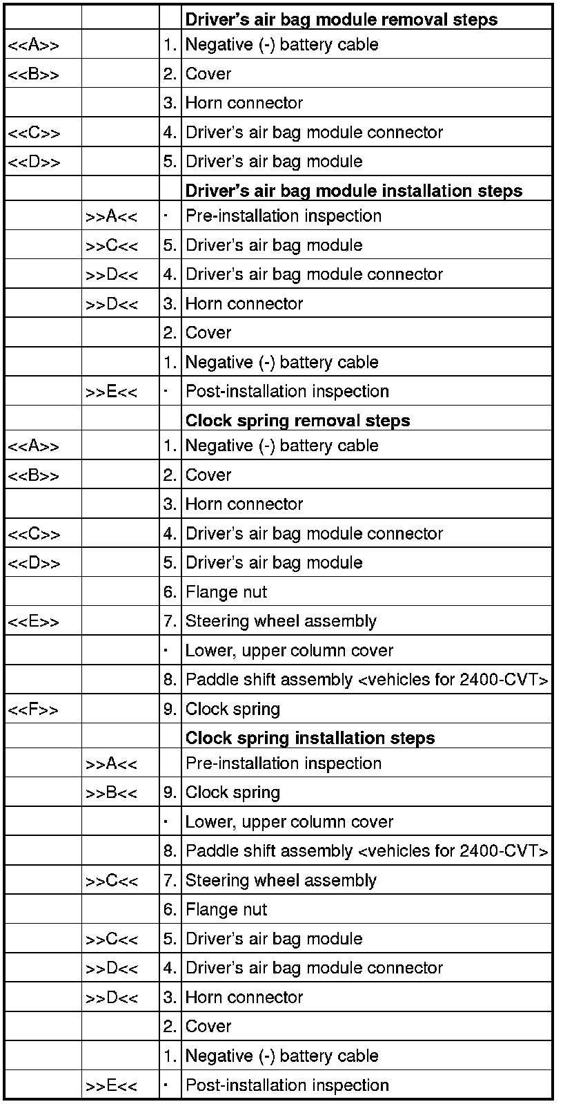 When installing the new air bag modules and clock spring, refer to "INSPECTION" ( Driver's Air Bag Module Inspection (Except Ralliart)).
