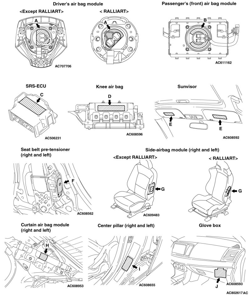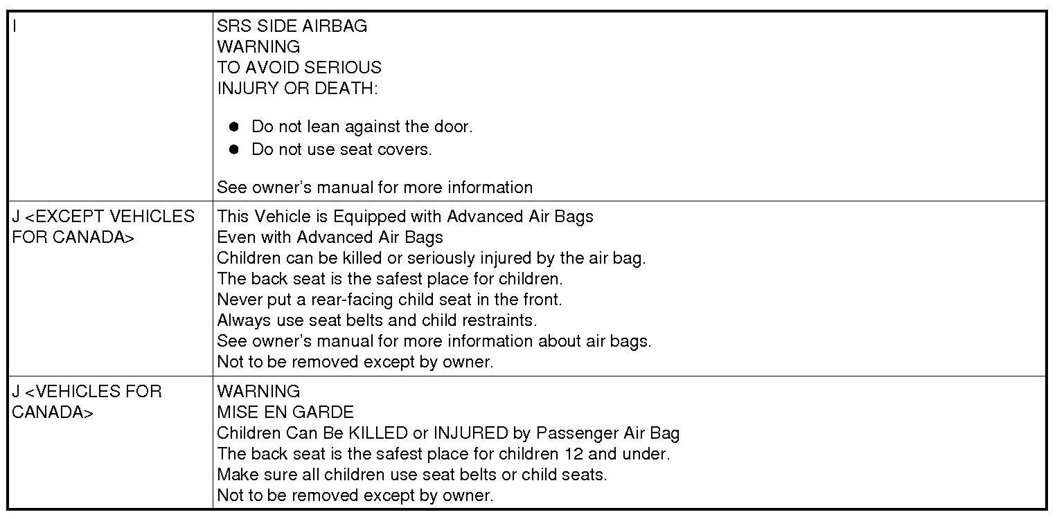 A number of caution labels related to the SRS are found in the vehicle, as shown in the following illustrations. Follow label instructions when servicing SRS. The label I is not to be removed except by owner. If the other labels are dirty or damaged, replace them.