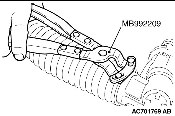 - Hold the rack housing, and use special tool bellows band crimping tool (MB992209) to crimp the bellows band securely.