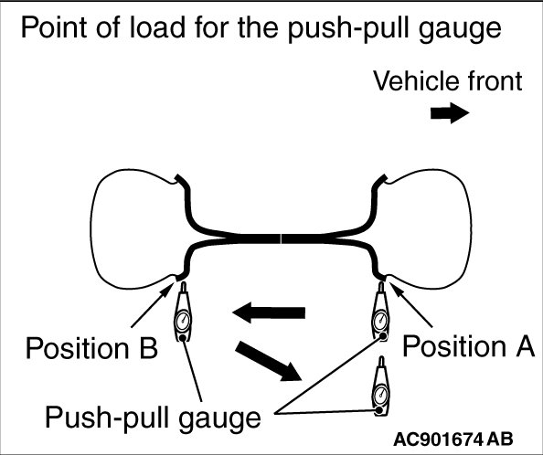 4. To stabilize the relationship between the load and fluctuation, push with the specified load by wheel size in the order of "Position A, "Position B", and "Position A" using the push-pull gauge. Note that the pushed load on each position shall be extracted.
