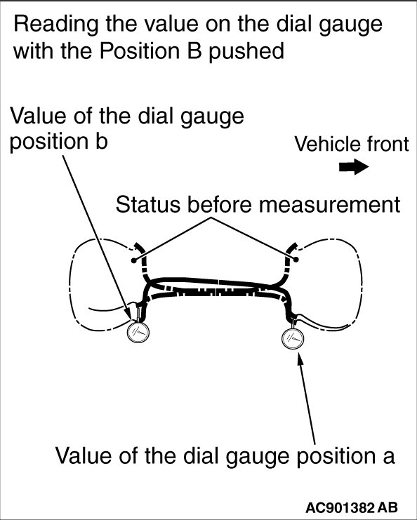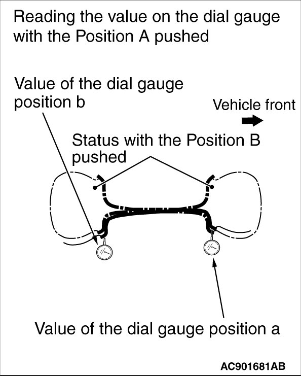 (2) Remove the load in the "Position B". Then while pushing the "Position A" with the specified load by wheel size, read the values on the dial gauge in the "Position a" and "Position b".
