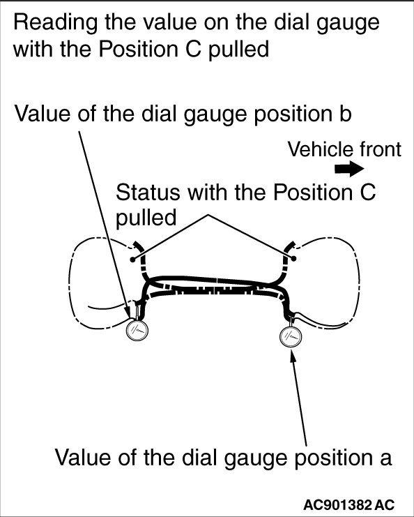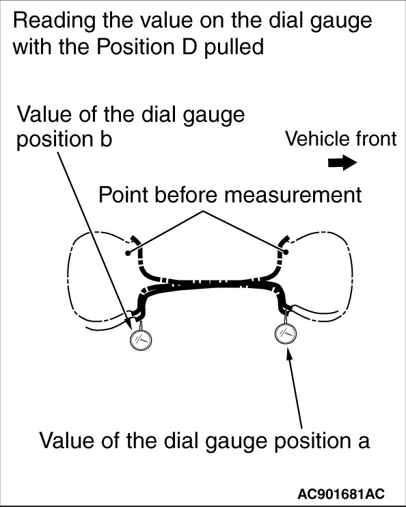 (1) While pulling the "Position D" with the specified load by wheel size, read the values on the dial gauges in the "Position a" and "Position b". The values on the dial gauges at this time shall respectively be "aD" and "bD".