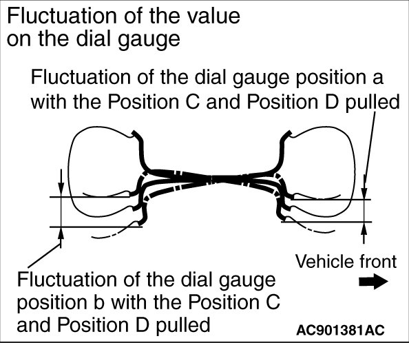 (2) Remove the load at the "Position D". Then while pulling the "Position C" with the specified load by wheel size, read the values on the dial gauge in the "Position a" and "Position b".
