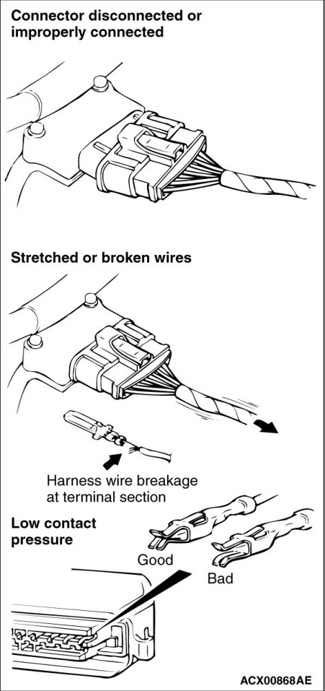 Use special tool, MB991219 to inspect the engagement of the male pins and female pins. [Pin drawing force: 1 N (0.2 pound) or more]