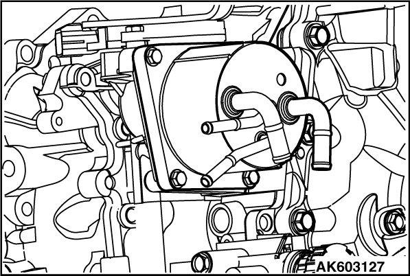 14. Remove the transmission fluid cooler from the transaxle case, and detach the O-ring from the cooler.