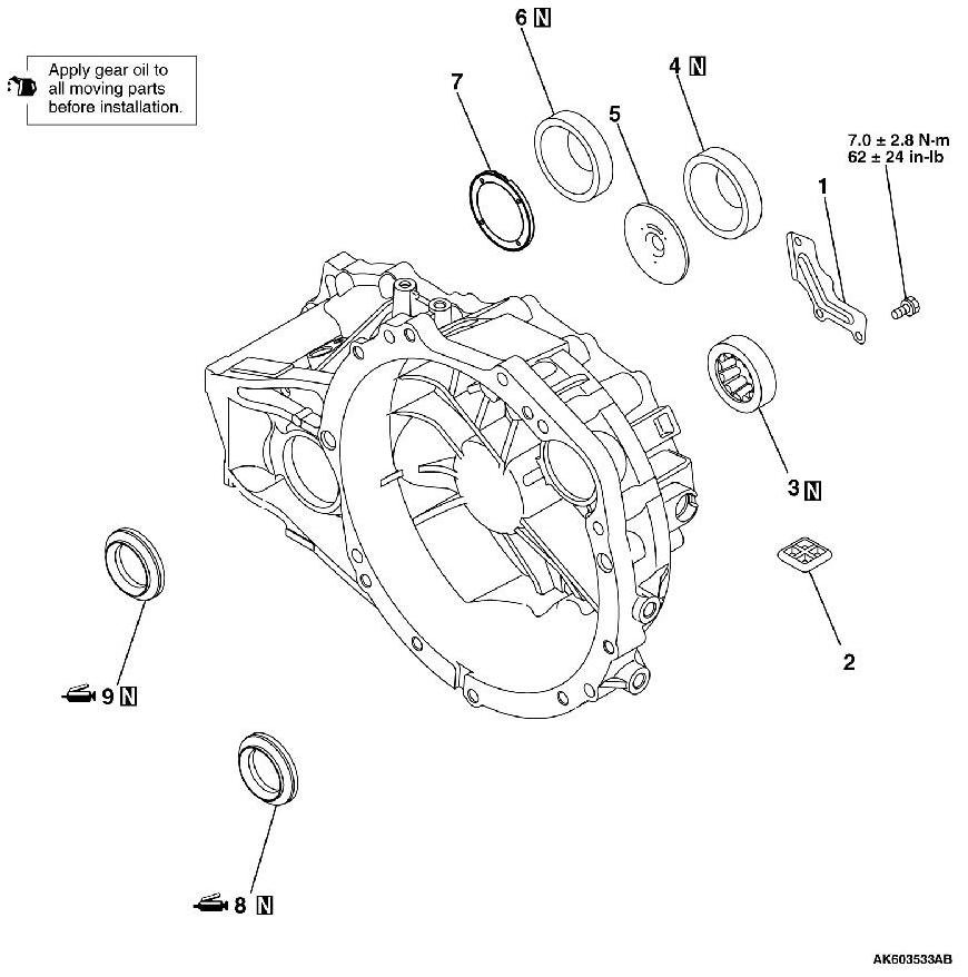 Install the extension housing oil baffle to the clutch housing case assembly with its projections fitted in the slots in the clutch housing case assembly.