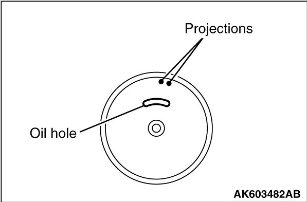 Install the output shaft cover to the clutch housing case assembly with its projections fitted in the slots in the clutch housing case assembly. Make sure that the oil hole in the output shaft cover is up as shown.