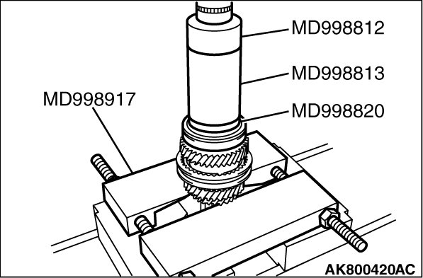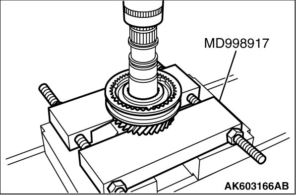 Using special tool MD998917, support the 3rd gear sub- assembly and remove the 3rd gear sub- assembly, synchronizer sleeve No.2 and synchronizer hub No.2.