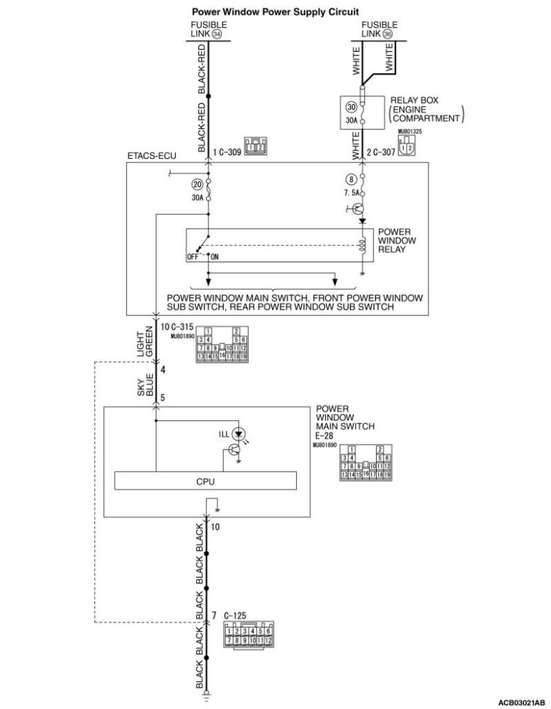 The ETACS-ECU turns on the power window relay to activate the power windows when the ignition switch (IG1) is turned to the "ON" position.