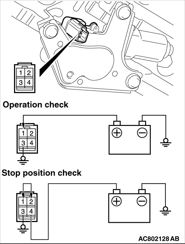 1. Connect the battery to the rear wiper motor as shown in the illustration.