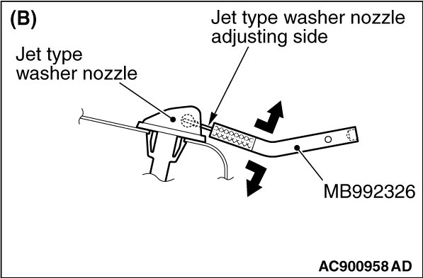 3. Move the special tool Adjustment tool, washer nozzle (MB992326) up and down to adjust the angle of the washer nozzle as shown in figure (B).