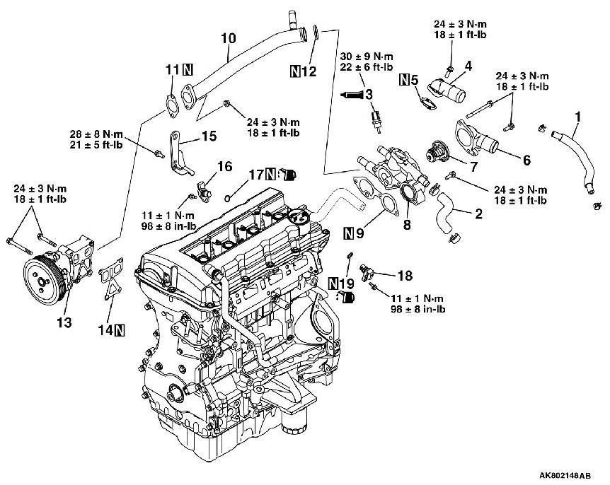 4. Temporarily tighten them to the cylinder head and water pump. Then tighten them to the specified torque.