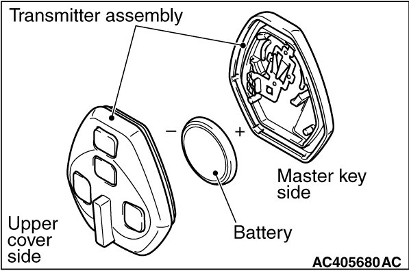 Install a new battery to the transmitter assembly with its (+) side facing towards the master key side.