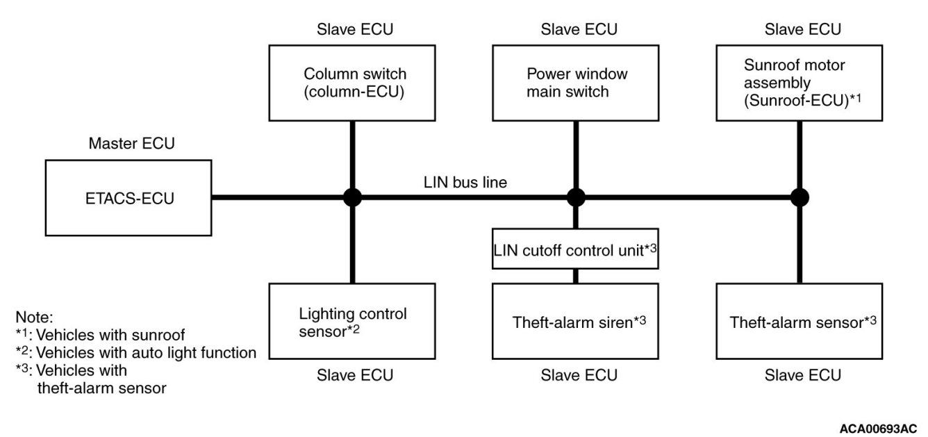 Master and slave ECUs are connected to the LIN bus lines. The master ECU is the ETACS*1-ECU, and the slave ECUs are the column switch (column-ECU), the power window main switch, the sunroof-ECU*2 and the lighting control sensor*3, the theft-alarm siren (via LIN cutoff control unit*4)*5 and the theft-alarm siren*5. The master ECU requests these slave ECUs to communicate each other via communication lines.