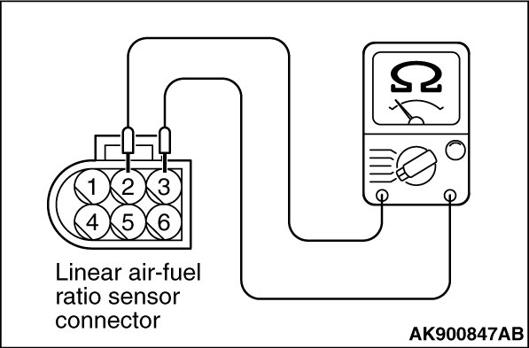 1. Disconnect the linear air-fuel ratio sensor connector and connect special tool MB991658 to the connector on the linear air-fuel ratio sensor side.